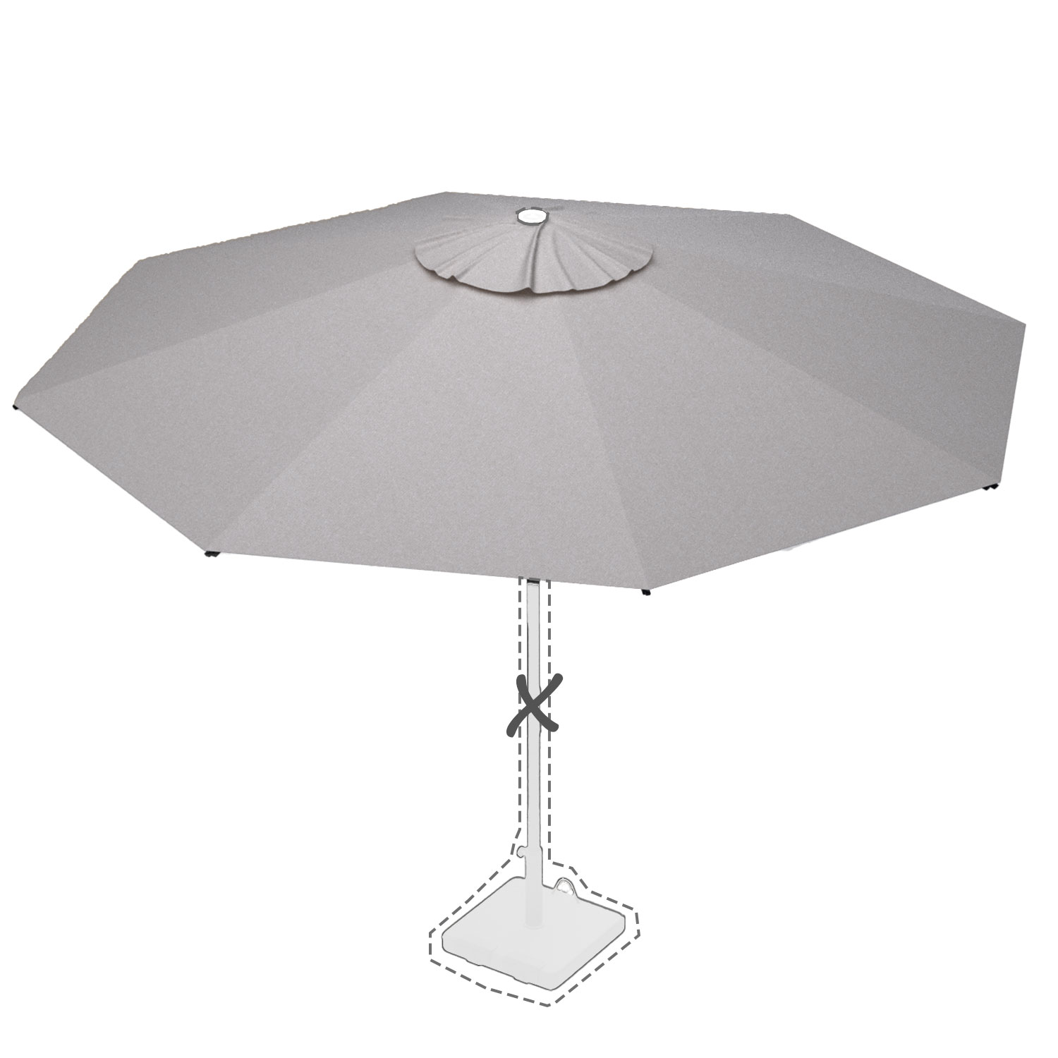 Met de afmeting wordt de afmeting van de parasolkap in geopende stand bedoeld