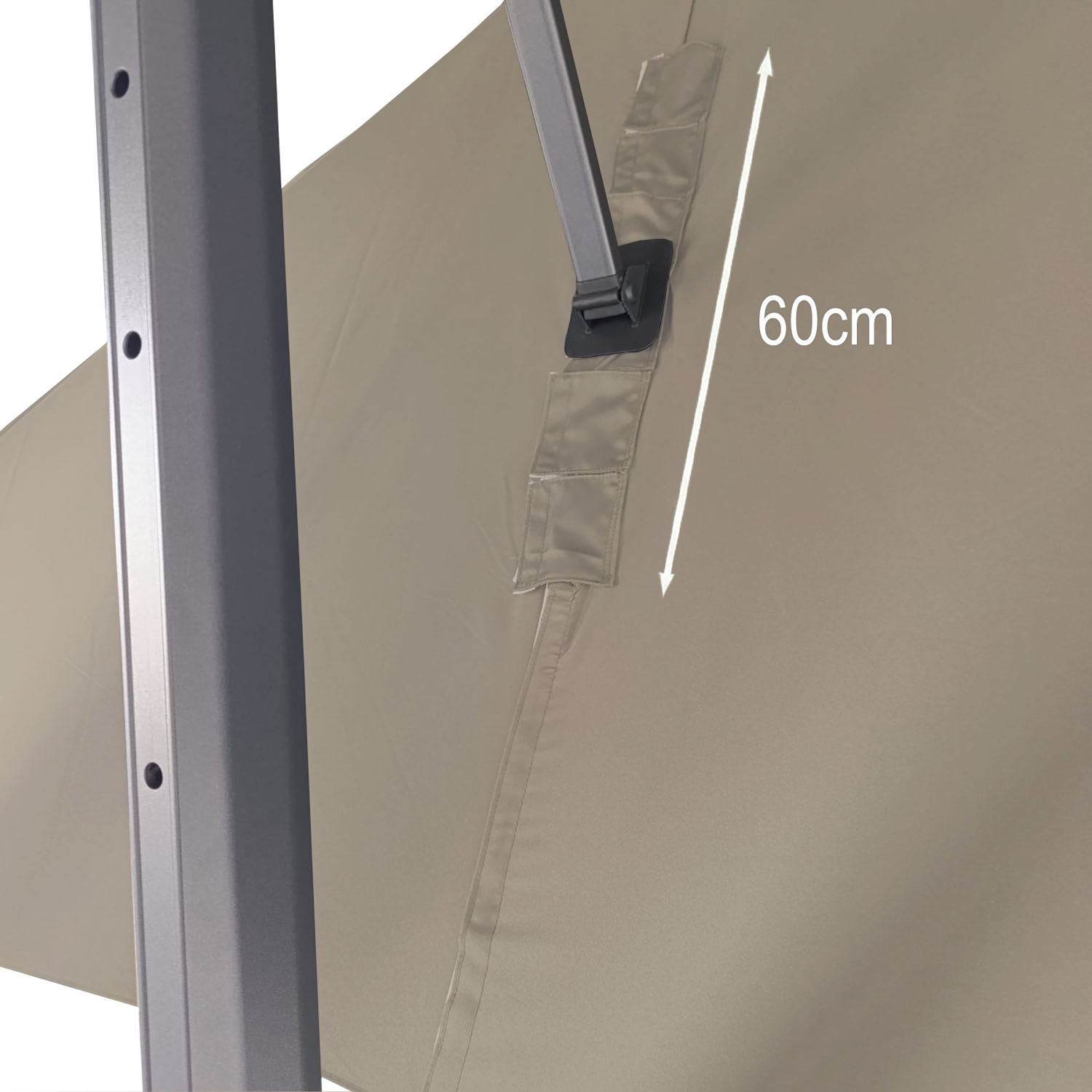 Bij vierkante en rechthoekige parasols wordt de afmeting opgegeven in lengte x breedte. Bij ronde parasols wordt de diameter (doorsnede) van de parasolkap als afmeting opgegeven. De diameter is de afstand tussen twee tegenoverliggende baleineindes. Alle opgegeven maten zijn gecalculeerde en afgeronde maten. In de praktijk zijn de parasols meestal net iets kleiner dan de aangegeven fabrieksmaten. Dieptevariant: Deze parasols zijn speciaal ontworpen voor plaatsing aan de kopse kant van je tafel, zithoek of ligbed.