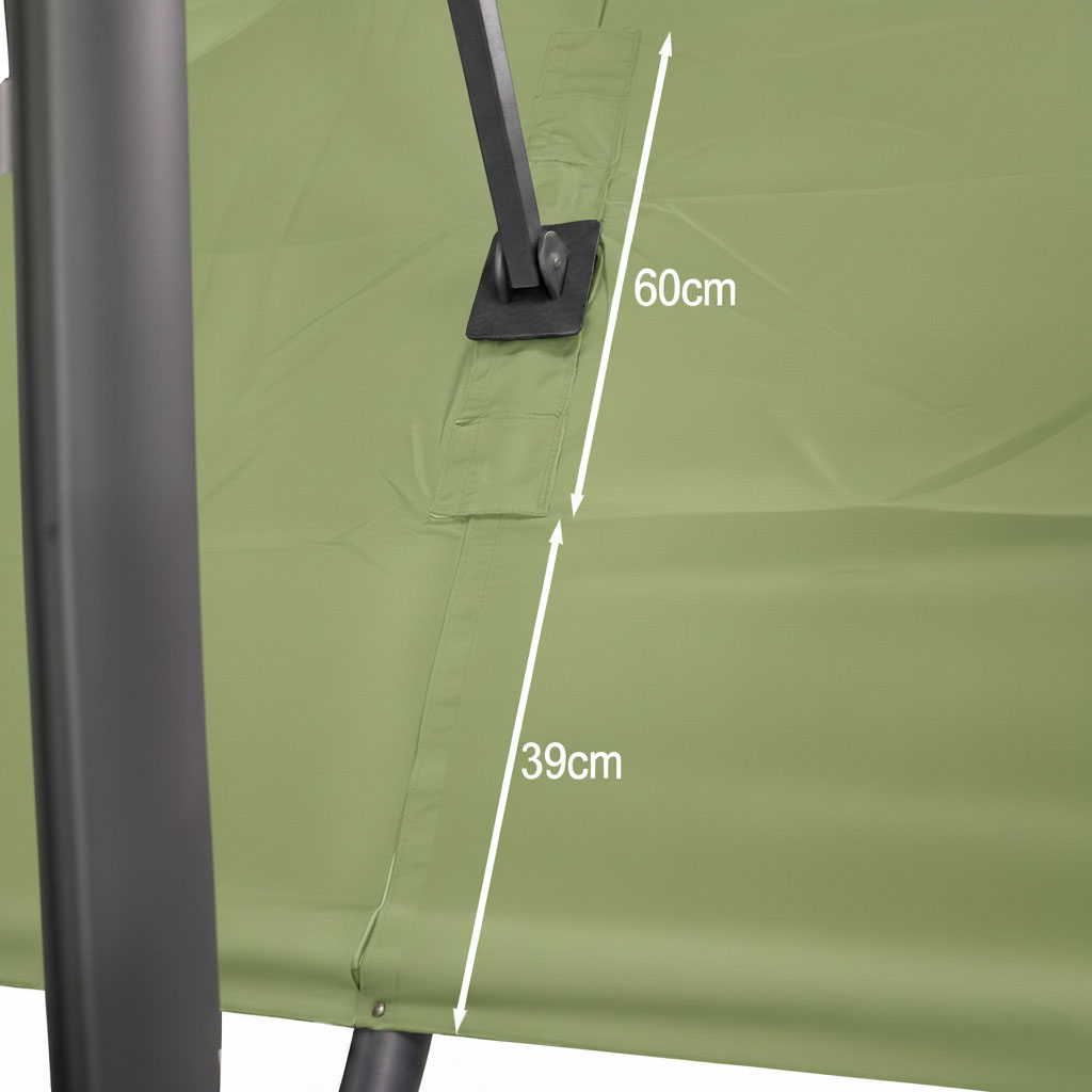 Bij vierkante en rechthoekige parasols wordt de afmeting opgegeven in lengte x breedte. Bij ronde parasols wordt de diameter (doorsnede) van de parasolkap als afmeting opgegeven. De diameter is de afstand tussen twee tegenoverliggende baleineindes. Alle opgegeven maten zijn gecalculeerde en afgeronde maten. In de praktijk zijn de parasols meestal net iets kleiner dan de aangegeven fabrieksmaten. Dieptevariant: Deze parasols zijn speciaal ontworpen voor plaatsing aan de kopse kant van je tafel, zithoek of ligbed.