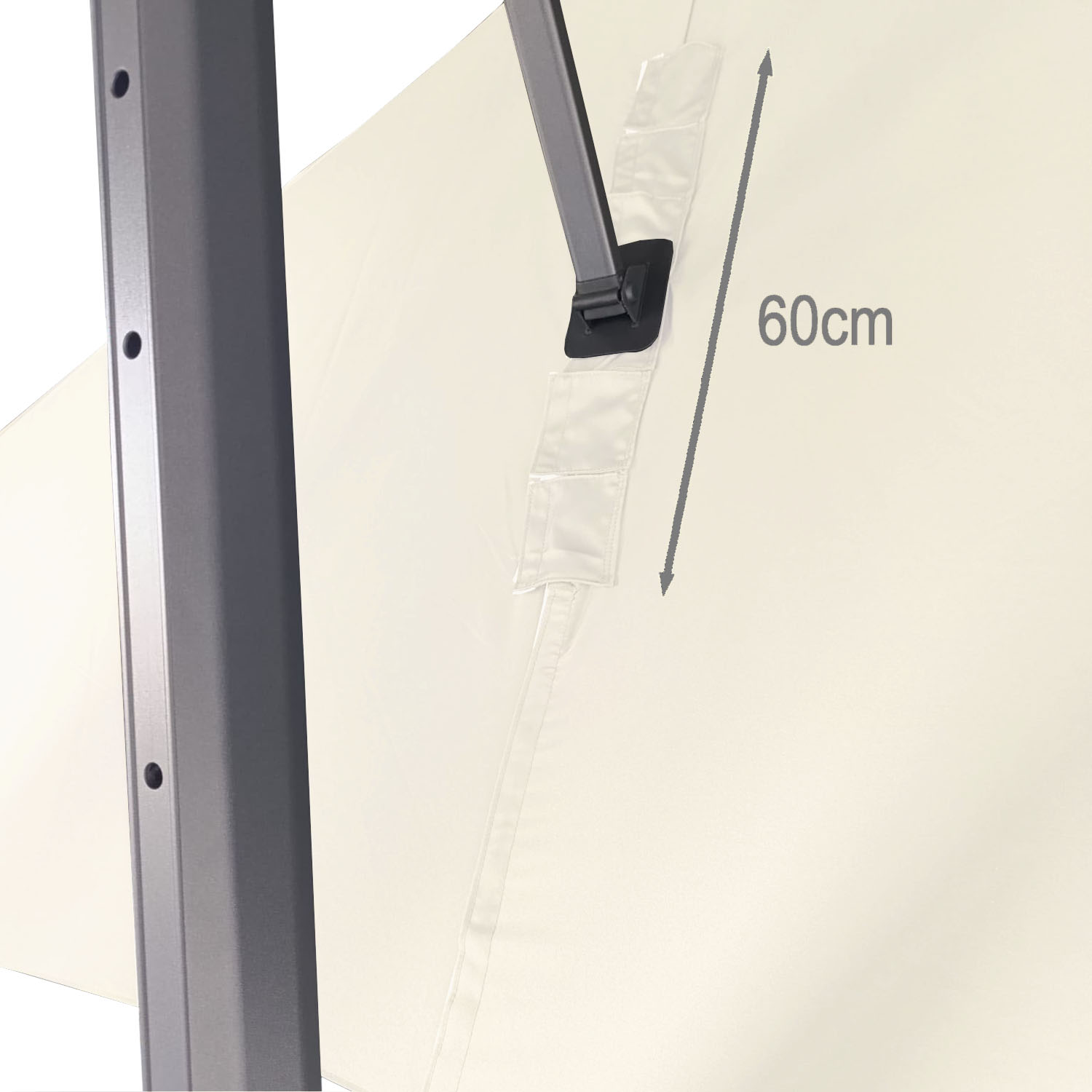 Bij vierkante en rechthoekige parasols wordt de afmeting opgegeven in lengte x breedte. Bij ronde parasols wordt de diameter (doorsnede) van de parasolkap als afmeting opgegeven. De diameter is de afstand tussen twee tegenoverliggende baleineindes. Alle opgegeven maten zijn gecalculeerde en afgeronde maten. In de praktijk zijn de parasols meestal net iets kleiner dan de aangegeven fabrieksmaten. Dieptevariant: Deze parasols zijn speciaal ontworpen voor plaatsing aan de kopse kant van je tafel, zithoek of ligbed.