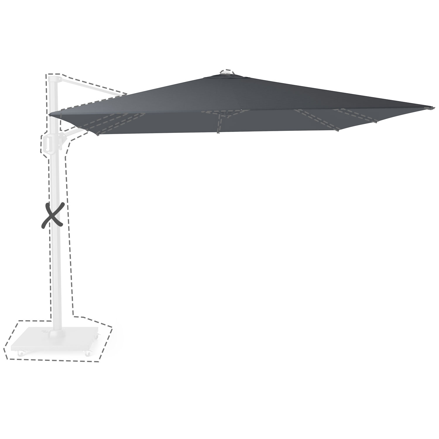 Dieptevariant: Deze parasols zijn speciaal ontworpen voor plaatsing aan de kopse kant van je tafel, zithoek of ligbed.