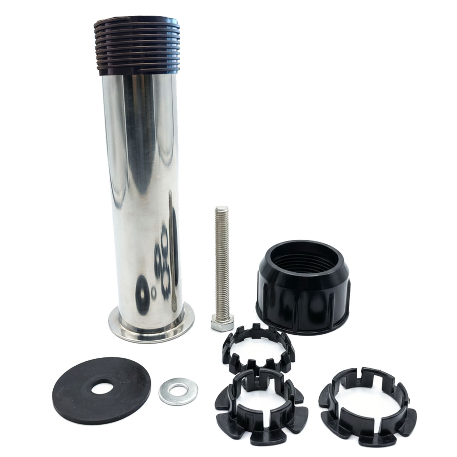Deze RVS buis dient als opzetstuk voor een graniet- of betonvoet. Door de meegeleverde klemvulringen is de buis passend voor alle parasols met een diameter van 35-56mm. Middels de meegeleverde M12 bout (schroefdraad ca. 6,5cm), revet en rubber kan de buis bevestigd worden aan de parasolvoet. Hiervoor dient de bout vanuit de onderzijde van de voet bevestigd te worden. De buis heeft een waterafvoer, zodat regenwater eenvoudig kan weglopen.