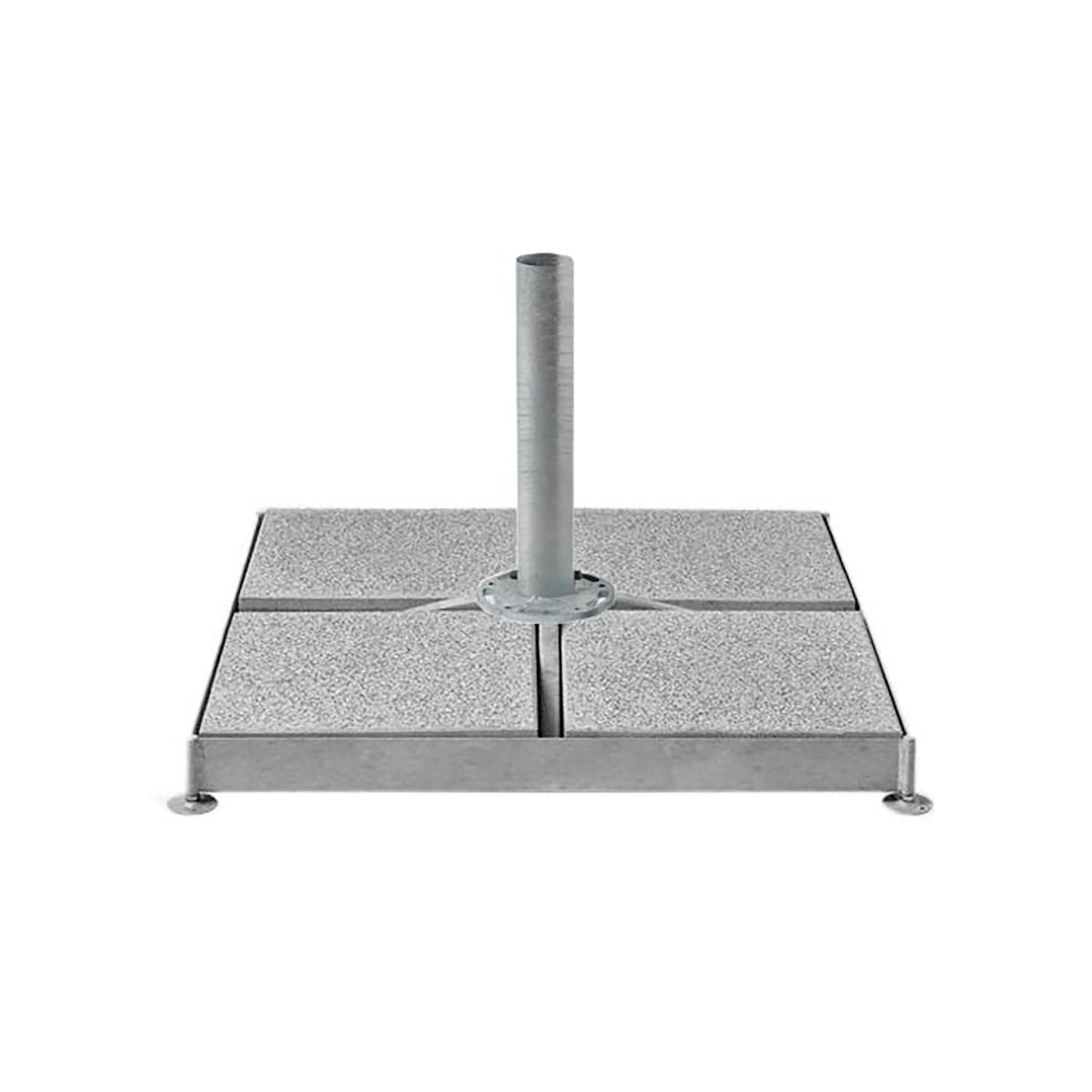 Deze parasolvoet bestaat uit een voet en een staander. De voet is gemaakt van verzinkt staal en heeft een afmeting van 91x91x11,5-15,5cm. De voet moet worden gevuld met tegels die een afmeting hebben van 40x40x4cm. De tegels worden niet meegeleverd. De staander is geschikt voor de Glatz Pendalex® P+ zweefparasol en de Glatz Fortello® stokparasols.