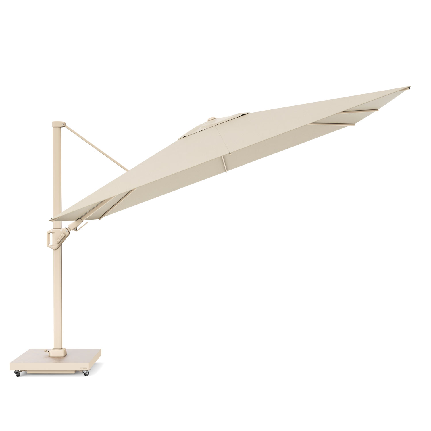 Deze parasols zijn speciaal ontworpen voor plaatsing aan de kopse kant van je tafel, zithoek of ligbed. De paal van de parasol bevindt zich aan de korstte zijde.