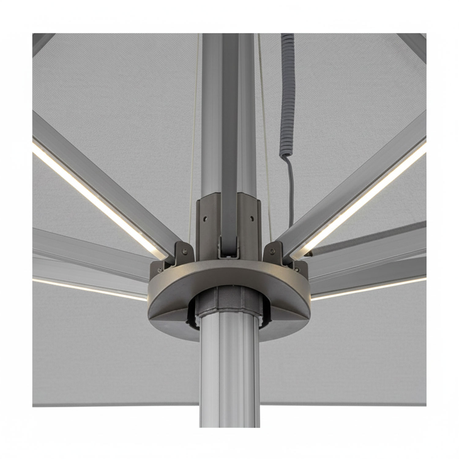 Led verlichting toevoegen aan je Glatz-parasol: 4 led-strips geïntegreerd in de baleinen van de parasol. Deze optie wordt in de fabriek geïnstalleerd en is later niet los toe te voegen.