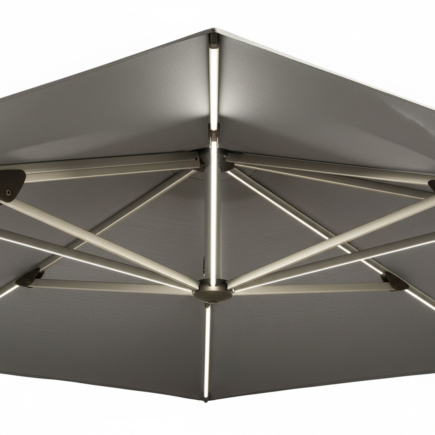 Led verlichting toevoegen aan je Glatz Ambienta nova parasol: 4 led-strips geïntegreerd in de baleinen van de parasol. Verlichting in de mast van de parasol. Deze optie wordt in de fabriek geïnstalleerd en is later niet los toe te voegen.