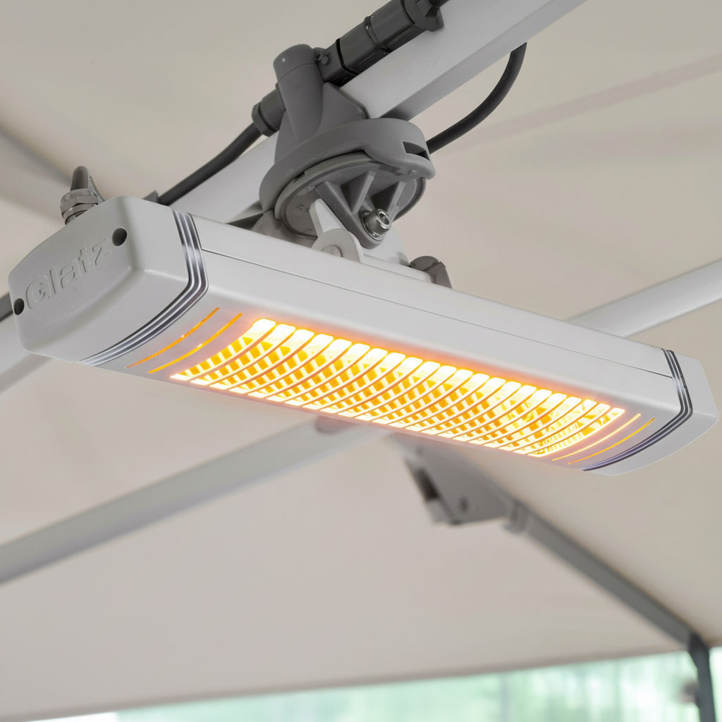 Verwarming toevoegen aan je Glatz-parasol: 4 verwarmingsstraler (infrarood). Deze optie wordt in de fabriek geïnstalleerd en is later niet los toe te voegen.