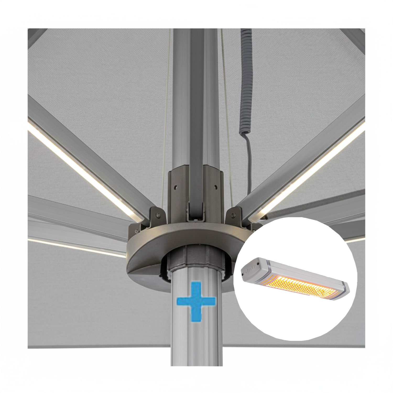 Voeg 4 x Led verlichting en 4 verwarmingsstralers toevoegen aan je Glatz Palazzo style parasol. De ledverlichting en de heaters worden in de fabriek geïnstalleerd en zijn later niet los toe te voegen.